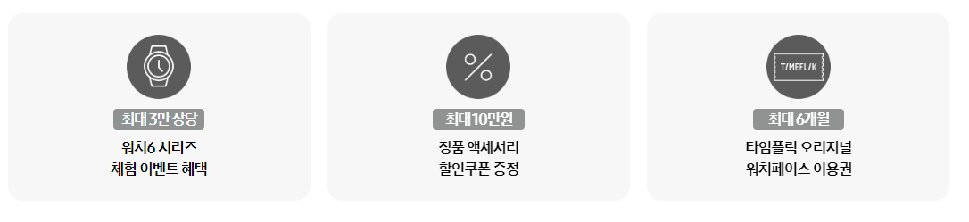 갤럭시 워치6의 출시일은 8월 11일입니다. 사전예약을 통해 선주문을 받고 있는데 사전 예약기간은 공식 갤럭시 워치 6 출시일 전 7월 27일 ~8월 7일까지 진행이 됩니다. 사전예약 상품으로는 갤럭시 워치 6은 6만 원 할인쿠폰, 갤럭시워치 6 클래식은 10만 원 할인 쿠폰을 증정합니다. 해당 할인 쿠폰으로 정품 액세서리 할인받아 구매할 수 있습니다. 현재 갤럭시 워치 6시리즈 체험 이벤트 도 하고 있고 , 타임플릭 오리지널 워치페이스 이용권도 최대 6개월 제공해 준다고 합니다. 워치페이스 이용권의 경우 9월 30일 기간 내 구매하신 분들 중 이용권 쿠폰번호를 등록하는 고객에 한해 서비스를 제공한다고 합니다. 쿠폰 발급기간은 9월 30일 가지 등록기간은 올해 12월 31일까지 이니 여유로워서 9월 안에 구매하시고 올해 안에 사용하시면 될 것으로 보입니다.