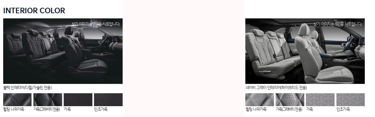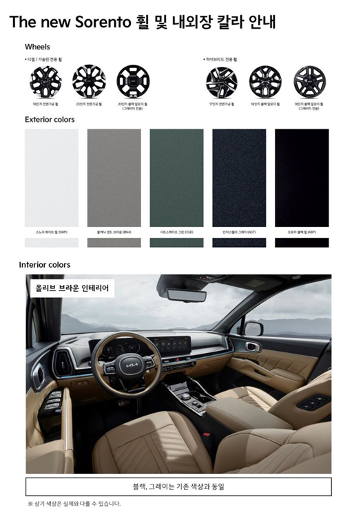 기존에는 새들브라운이라는 내장 컬러가 있었다면 , 새들브라운은 사라지고 올리브 브라운이 새로 생겼습니다. 이미지를 보시면 아시겠지만 기존 밝았던 브라운에서 조금 더 딥한 색상으로 보입니다. 개인적인 소견으로는 새들브라운이 밝은 느낌이라 조금 조심스러웠는데 톤다운이 된 올리브 브라운은 조금 더 마음이 가게 되는 것 같습니다. 올리브 브라운은 공통으로 선택이 가능합니다. 쏘렌토 하이브리드, 가솔린, 디젤 구분이 없단 얘기입니다. 그래서 그런지 대부분의 쏘렌토 오너들은 올리브 브라운을 많이 선택할 것 같네요. 쏘렌토 하이브리드는 네이비/그레이, 쏘렌토 디젤/가솔린은 블랙이라는 단일 컬러가 있습니다. 기존 컬러와는 동일한 컬러라고 소개가 되고 있어서 , 하단 기존 가격표에 나와있는 이미지 첨부드리니 비교하신 다음 색상 결정 하시면 될 것 같습니다!