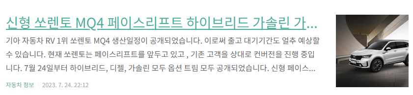 | 신형 쏘렌토 MQ4 페이스리프트 하이브리드 가솔린 가격,출고 기간,가격표,제원 (0) | 2023.07.24 |
