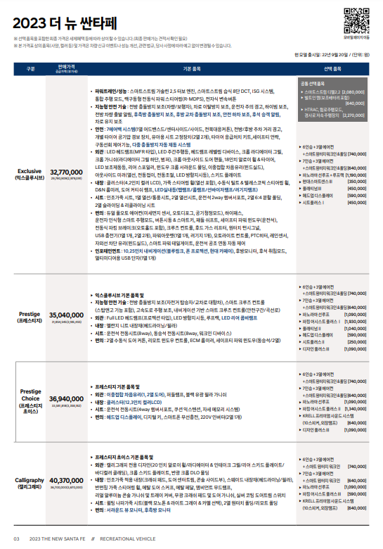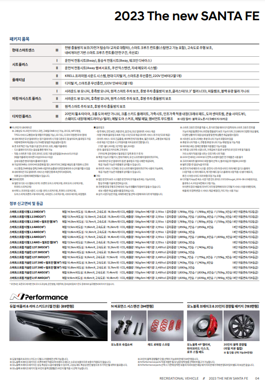 싼타페 풀체인지 가솔린 제원은 어느정도 오픈이 되어있는 상태 이지만 모든정보가 오픈되어있는건 아닙니다. 아래표를 참고 해주시면서 다른 차량과 비교해보시면 좋고, 또 오픈된 정보를 확인했을대 싼타페 풀체인지 제원은 최대 출력 281ps/5800rpm , 변속기 DCT8단 , 배기량 2497CC , 중량(총중량/공차중량)2280kg/1795kg 으로 확인 되었습니다. 기존 2022년식의 배기량 , 최고출력 은 동일하며 , 차체 무게에만 변화가 있는데 기존모두 조금 더 무겁게 확인 되었습니다. 쏘렌토와 비교했을때에도 사양은 비슷하지만 무게만 조금 더 무겁습니다.