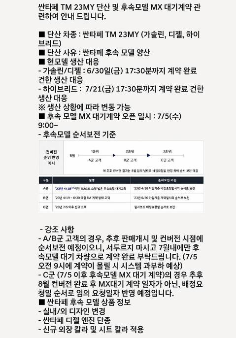 싼타페 풀체인지는 7월5일부터 사전계약에 돌입 했습니다. 이례적이긴 하지만 이번 싼타페 풀체인지 사전예약은 조용히 시작되었고, 아직 이렇다할 광고가 나온다거나 활발한 홍보를 하고 있지는 않습니다. 아직 차량 23MY에 대한 생산이 다 마무리 되지 않은 상태라 그런게 아닐까 라는 예상을 하고 있습니다. 하이브리드 까지는 7/21(금) 17:30분 까지 계약 완료 한건에 한해서만 생산을 기존 모델로 출고 하고 있는데 , 기존 차량이 모두 생산되어 출고가 마무리되는 시점에 광고가 시작되지 않을까 싶습니다. 하지만 사전예약은 빨리하면 할수록 이득입니다. 빠르게 사전예약 하세요!