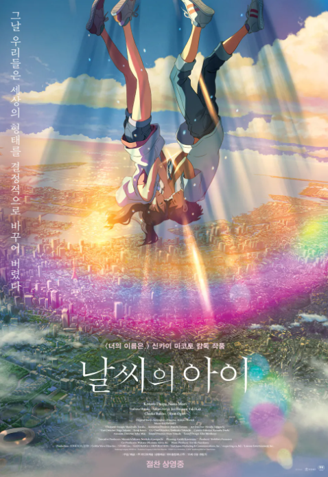 영화 날씨의 아이 장르는 판타지, 로맨스, 미스터리, 재난입니다. 감독 및 감독, 원작 모두 신카이 마코토입니다. 캐릭터 디자인 및 작화 감독은 타무라 아츠시 , 출연자(성우)는 일본판 다이고 코타로, 모리 나나, 키류 사쿠라 , 오구리 슌, 혼자 츠바사이고, 한국 성우는 심규혁, 김유림, 김서영, 최한, 강은애 등이 있습니다. 개봉일은 2019년 10월 30일입니다. 상영시간은 112분 대한민국 총 관객 수는 756,373명입니다. 상영등급은 15세 이상 관람가입니다. 이 영화는 날씨, 기상과 주인공의 운명을 중점으로 스토리가 이어져나갑니다. 희생과 사랑을 중점으로 둔 이 영화는 전 세계 관객들의 마음을 감동시켰고 흥행한 애니메이션이 되었습니다.