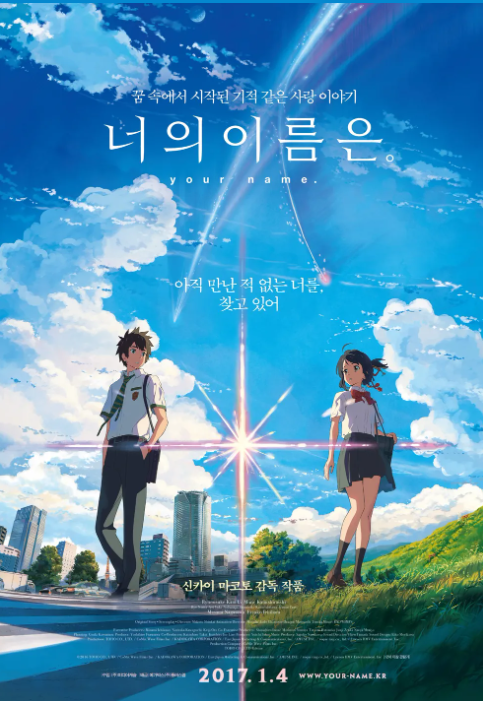 영화 너의 이름은 의 장르는 판타지, 로맨스, 드라마, 입니다. 기획 및 프로듀서는 카와무라 겐키 , 작화감독은 안도 마사시 외 다수이며 , 연출은 이무라 켄지가 맡았습니다. 출연은 일본 기준 카미키 류노스케, 카미시라이시 모네, 타니카논, 이사카와 카이토, 나가사와 마사미, 라니타 료시마자키 노부나가, 요우키 아오이 , 한국 성우로는 지창욱, 김소현, 이레, 장민혁, 최재호 , 박지윤, 김도영, 사성웅 등이 있습니다. 개봉일은 2017년 1월 4일이며 , 상영시간은 107분으로 1시간 46분입니다.