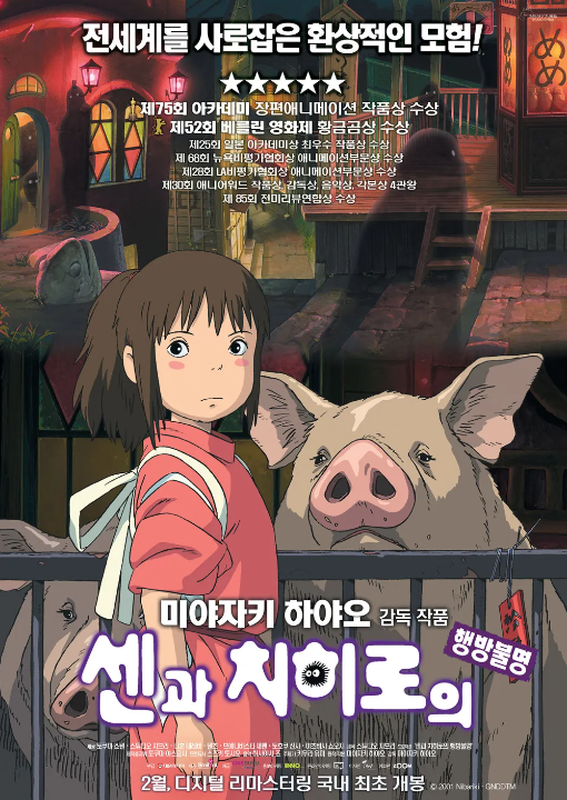 이 영화의 장르는 애니메이션 , 다크 판타지, 어드벤처입니다. 감독 및 간본은 미야자키 하야오 , 프로듀서는 스즈키 도시오입니다. 일본 성우는 히이라기 루미, 이리노 미유, 나츠키 마리, 나카무라 아키오 , 한국성우로는 최덕희 , 김영선, 성선녀, 최문자 입니다. 제작사는 스튜디오 지브리이며 , 개봉일은 한국 기준 2002년 6월 28일입니다. 상영시간은 125분이고 대한민국 총 관객수는 200만 명입니다. 상영등급은 전체관람가로 아이들과 보기에도 좋은 영화입니다. 미야자키 하야오가 제작 및 감독한 영화로 , 모노노케 히메를 내놓고 은퇴 선언을 했던 그는 감독을 안 하는 거였지 애니메이션 제작을 안 하는 건 아니었다고 합니다.하지만 그는 자신의 작품을 제대로 표현해 줄 만한 감독을 만나지 못했고 다시 감독으로 복귀할 수밖에 없었다고 합니다. 복귀작이다 보니 심혈을 기울여 만들었고 , 결국 흥행에 성공했습니다.