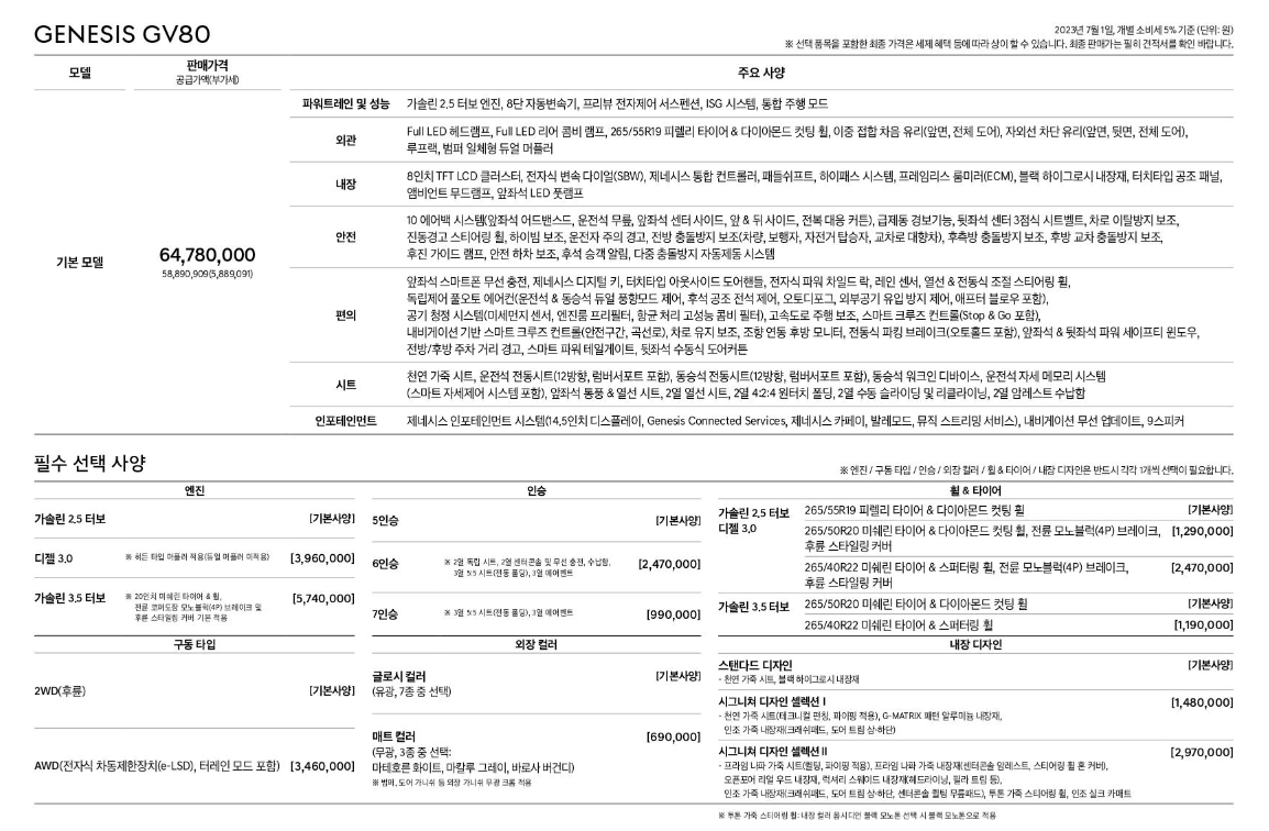 이번년도 하반기로 예정되어 있는 제네시스 GV80 페이스리프트 가격표의 경우 아직 오픈된 건 없습니다. 현재 기존 가격에서 조금 더 금액이 상향될 것으로만 보이고 있고 , 쿠페 도 마찬가지입니다. GV80 쿠페의 경우 기존 GV80보다 천만 원 정도 더 비싼 가격으로 출시가 될 것으로 예상이 되고 있으며 옵션 또한 조금 더 오를 것으로 예상하고 있습니다. 하단에 기존 GV80 가격표를 첨부해 둘 테니 참고하셔서 페이스리프트 가격 및 쿠페 가격도 어느 정도 예상 해보시면 좋을 것 같습니다.