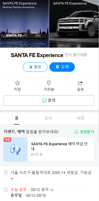 싼타페 익스피리언스 예약은 네이버 통해 예약이 가능했으나, 12일 부터 시작된 익스피리언스 예약은 당일 오후 5시에 마감이 되었습니다. 현재는 신청을 할 수 없는 상태로 , 네이버 예약 페이지에서는 예약 마감, 현장에서는 예약이 가능하다고 되어있지만 현재로서는 현장 예약이 어떻게 진행될지는 현재로서 정확히 알 수 없습니다. 현대자동차에서 추가로 나오는 공지를 통해 확인 가능할 것으로 확인됩니다!
