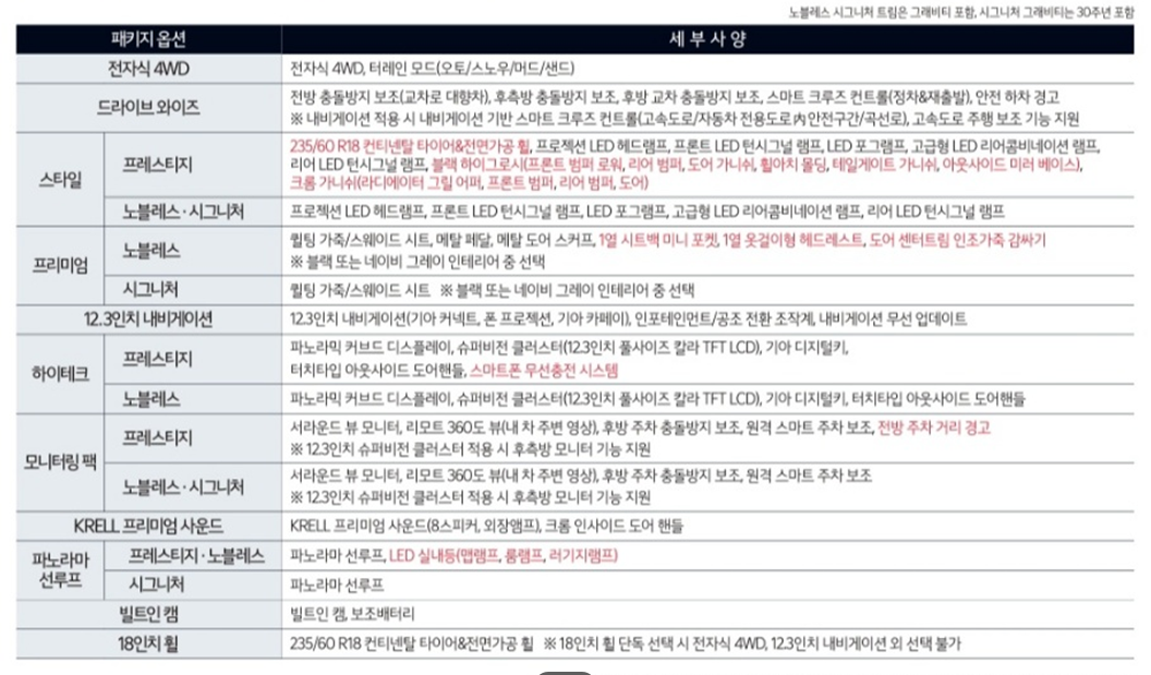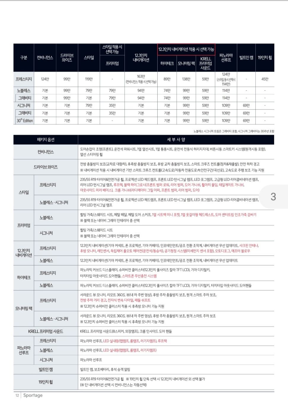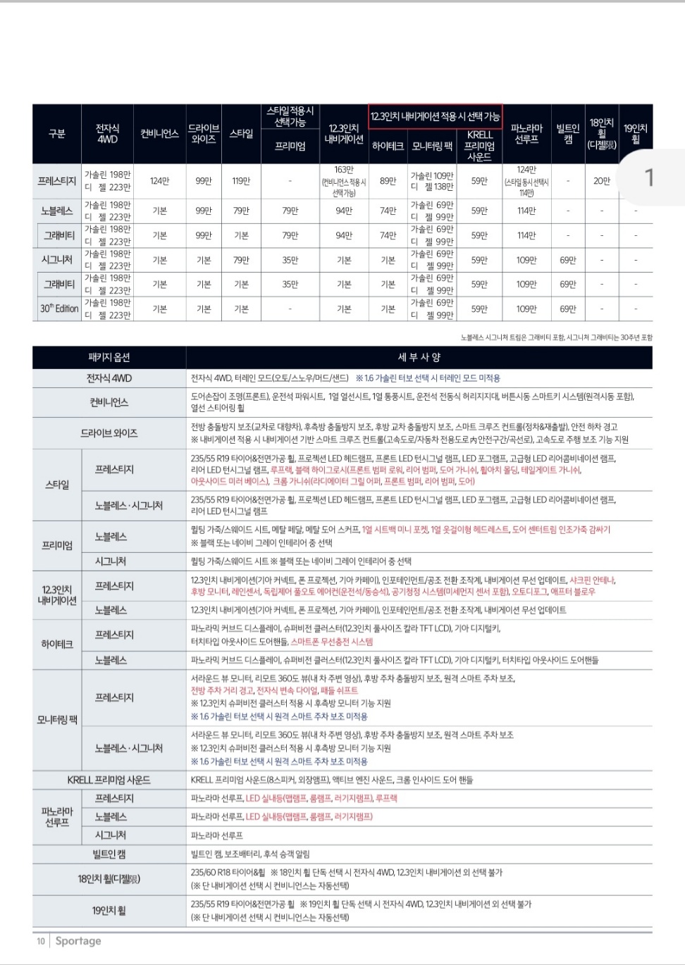 현재 기아 스포티지 NQ5의 경우 변화된 옵션은 프레스티지의 스타일과 , 노블레스의 프리미엄, 프레스티지의 하이테크, 프레스티지 모니터링팩, 파노라마 선루프입니다. 하단 이미지를 보시면 붉게 글씨색이 다른 부분이 이전 버전과는 다른 점을 표기해 둔 것으로 보입니다. 옵션이나 기본 가격은 올랐지만 대부분 그럴 경우 기본으로 들어가는 부분들이 조금씩 달라진 게 많습니다. 기아 스포티지 가격도 마찬가지입니다. 자세한 내용은 아래 표를 통해 주의 깊게 살펴보시길 바라겠습니다. 색상의 경우