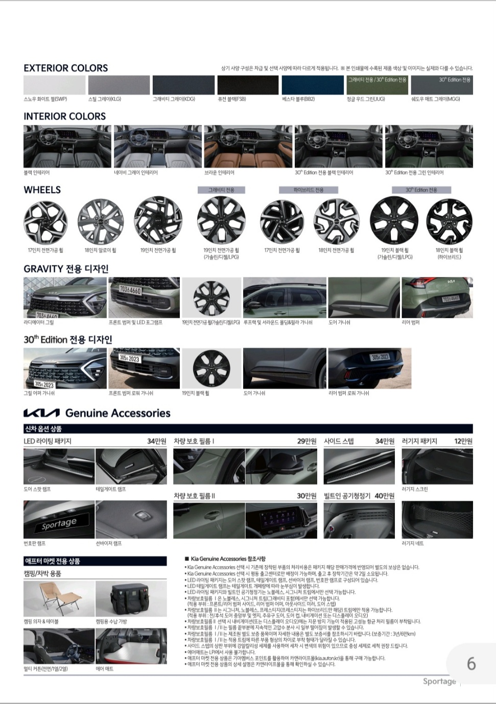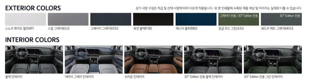 스포티지 색상의 경우 스노우화이트펄 , 스틸그레이, 그래비티 그레이, 퓨전 블랙, 베스타 블루, 정글 우드 그린, 쉐도우 매트 그레이로 운영되는데 여기에서 정글우드 그린은 그래비티 와 30주년 에디션 전용 색상, 쉐도우 매트 그레이는 30주년 단독 전용 상품입니다. 내장 색상의 경우 블랙, 네이비그레이, 브라운 , 30주년 블랙 전용 인테리어 , 30주년 그린 인테리어 가 있습니다. 블랙과 그린이 30주년 단독 에디션으로 나와서 조금 더 메리트가 있어 보입니다.