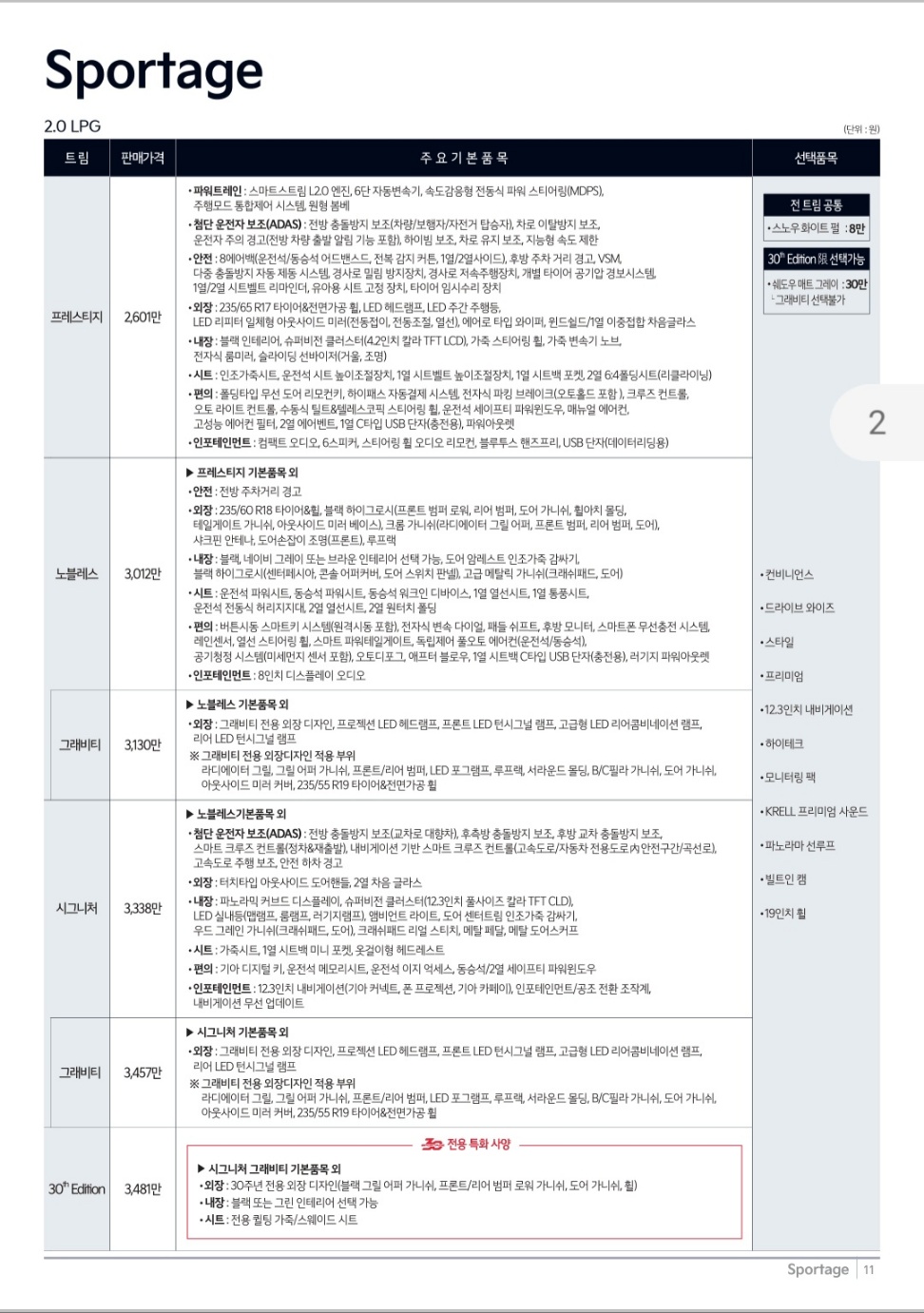 역시나 단연 가장 높은 트림은 30th Edition 입니다! 하지만 풀옵션이고 , 그만큼 값어치가 있기에 저는 다른 트림들보다는 30주년 에디션으로 가시는 게 어떨까 싶어요. 시그니처 그래비티에 옵션을 추가하면 금액이 크게 차이가 나지 않습니다. 상단 견적 내기를 통해 좀 더 자세한 견적을 내고 기아 스포티지 가격 비교를 해보시는 게 어떨까 싶습니다.