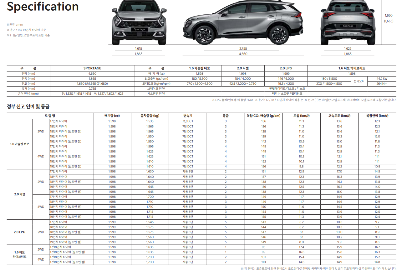 기아 스포티지 하이브리드 가솔린 디젤 디자인 및 제원